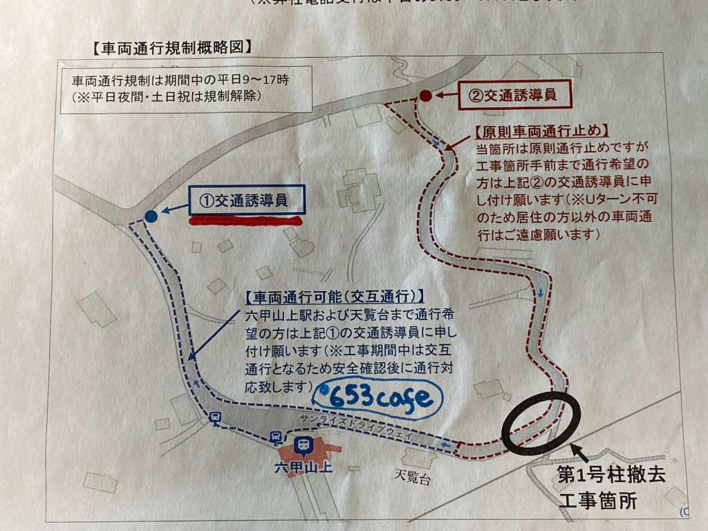 653cafeにご来店のお客さまは、下の図の①の交通誘導員に言って頂ければ車両通行が可能になります。